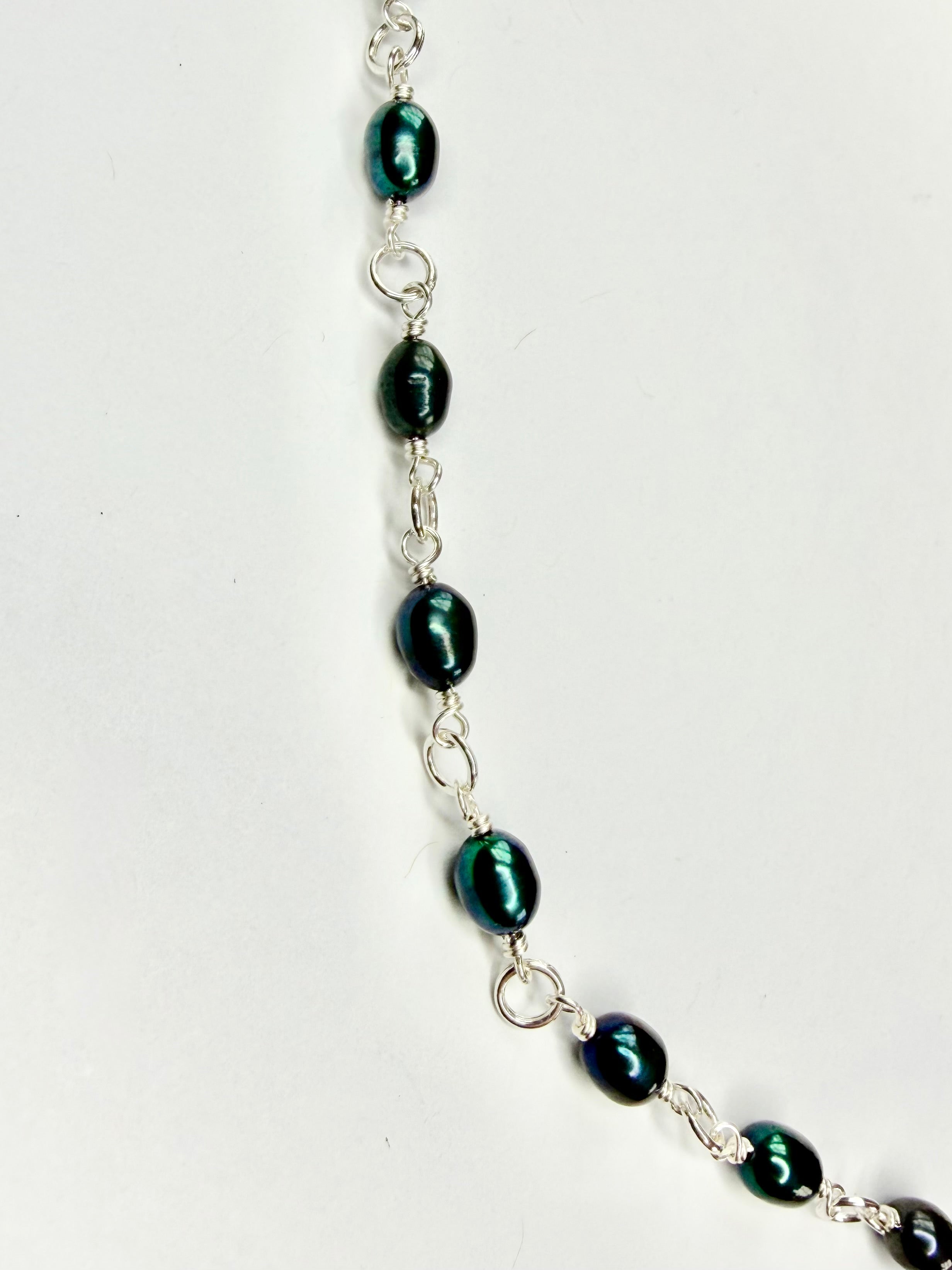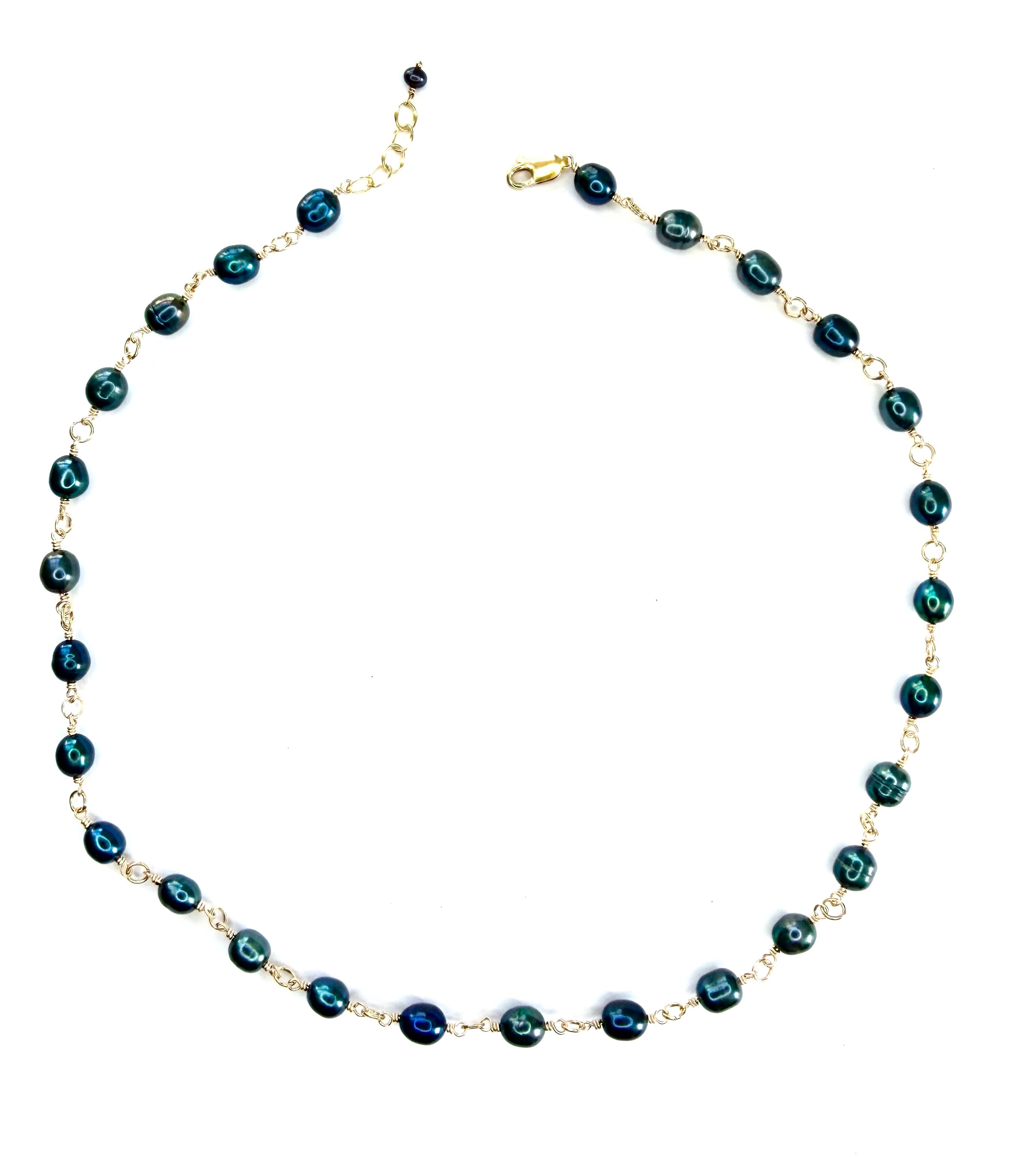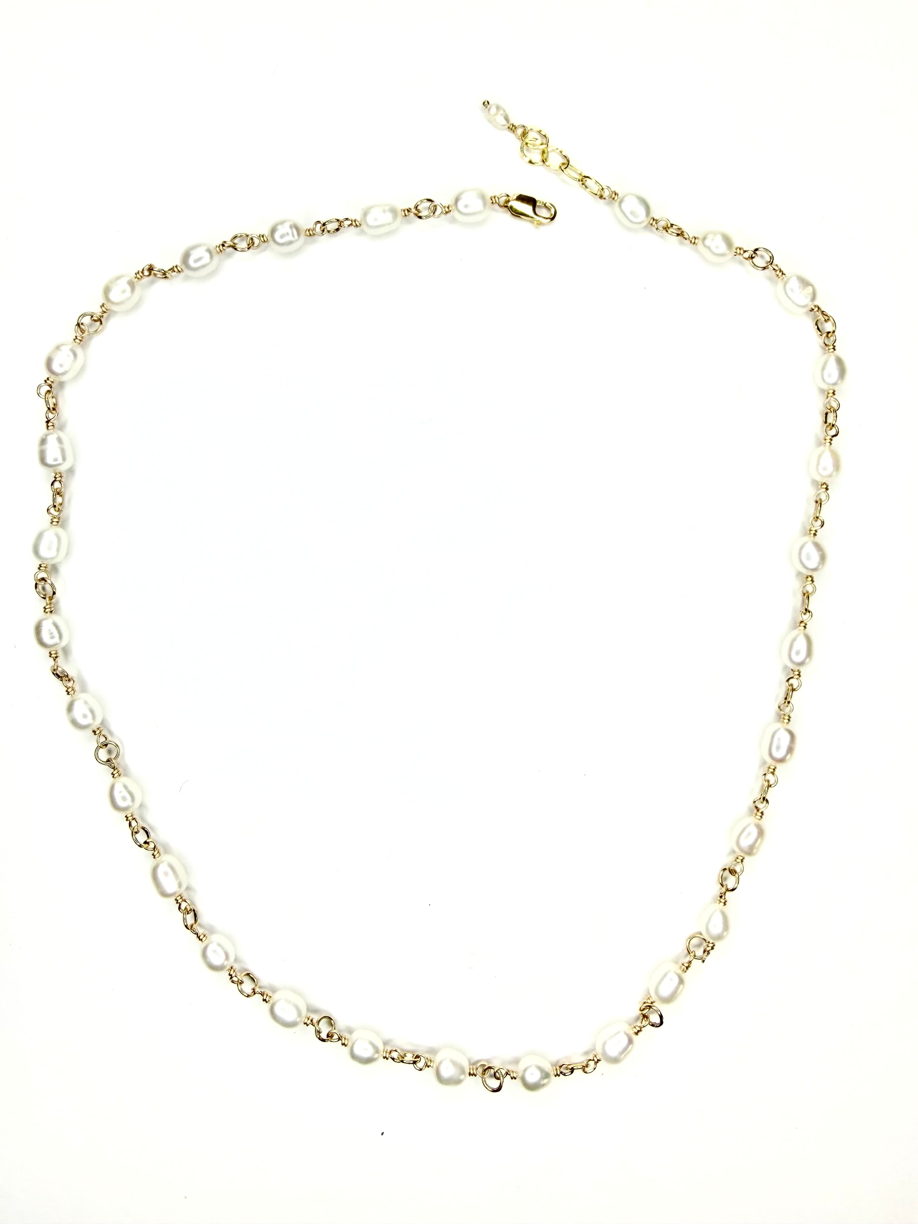 New to our winter 2025 collection. These white fresh water pearls are individually wrapped in sterling or gold fill and connected with a closed jump ring in between wraps, giving the necklace a clean and timeless look. Also available in a black fresh water pearl