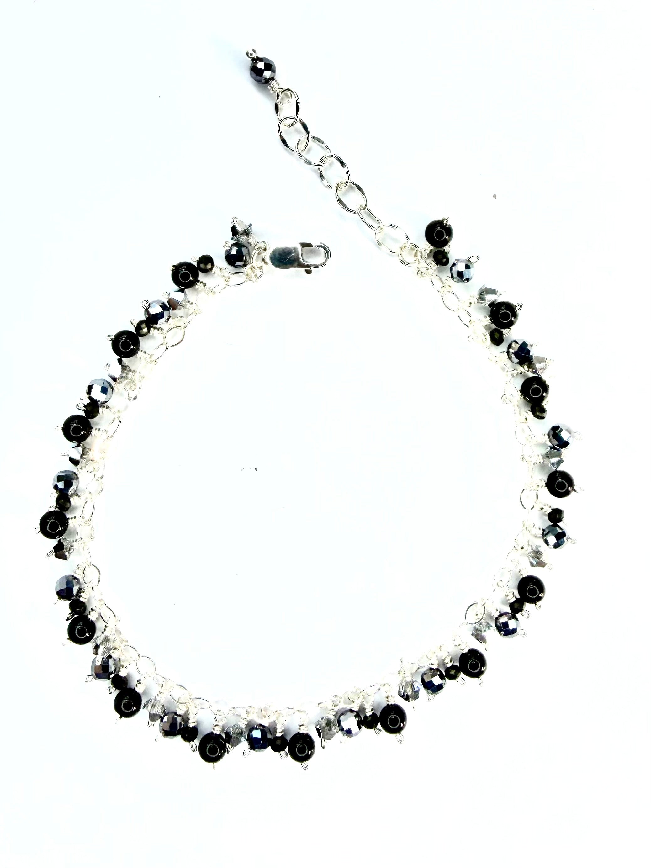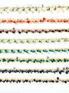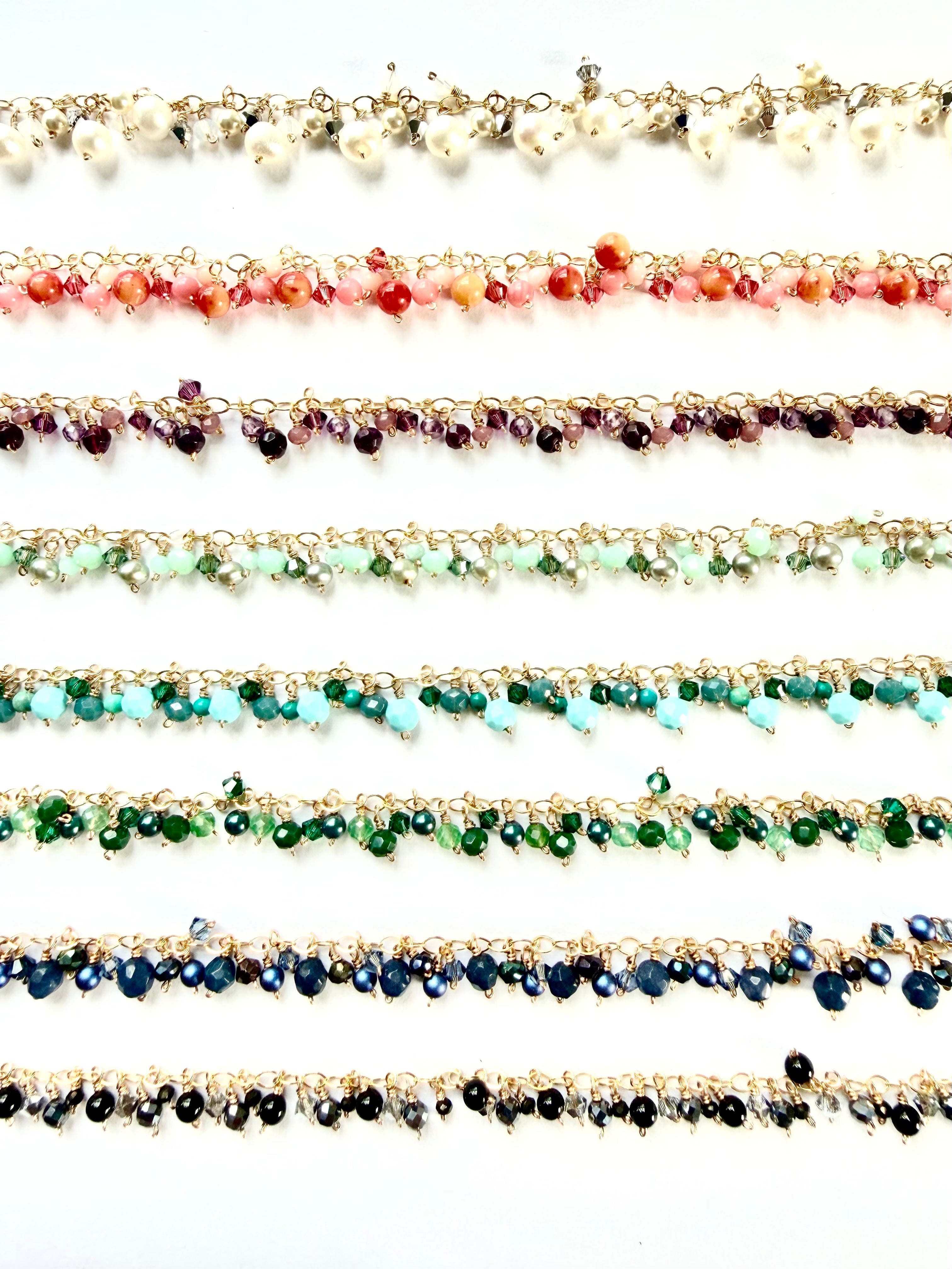 these cluster vine bracelets are 7” long and have pearls, gemstones and swarovski beads wrapped individually to each chain link giving it a beautiful, organic flow to the piece.