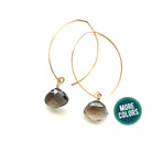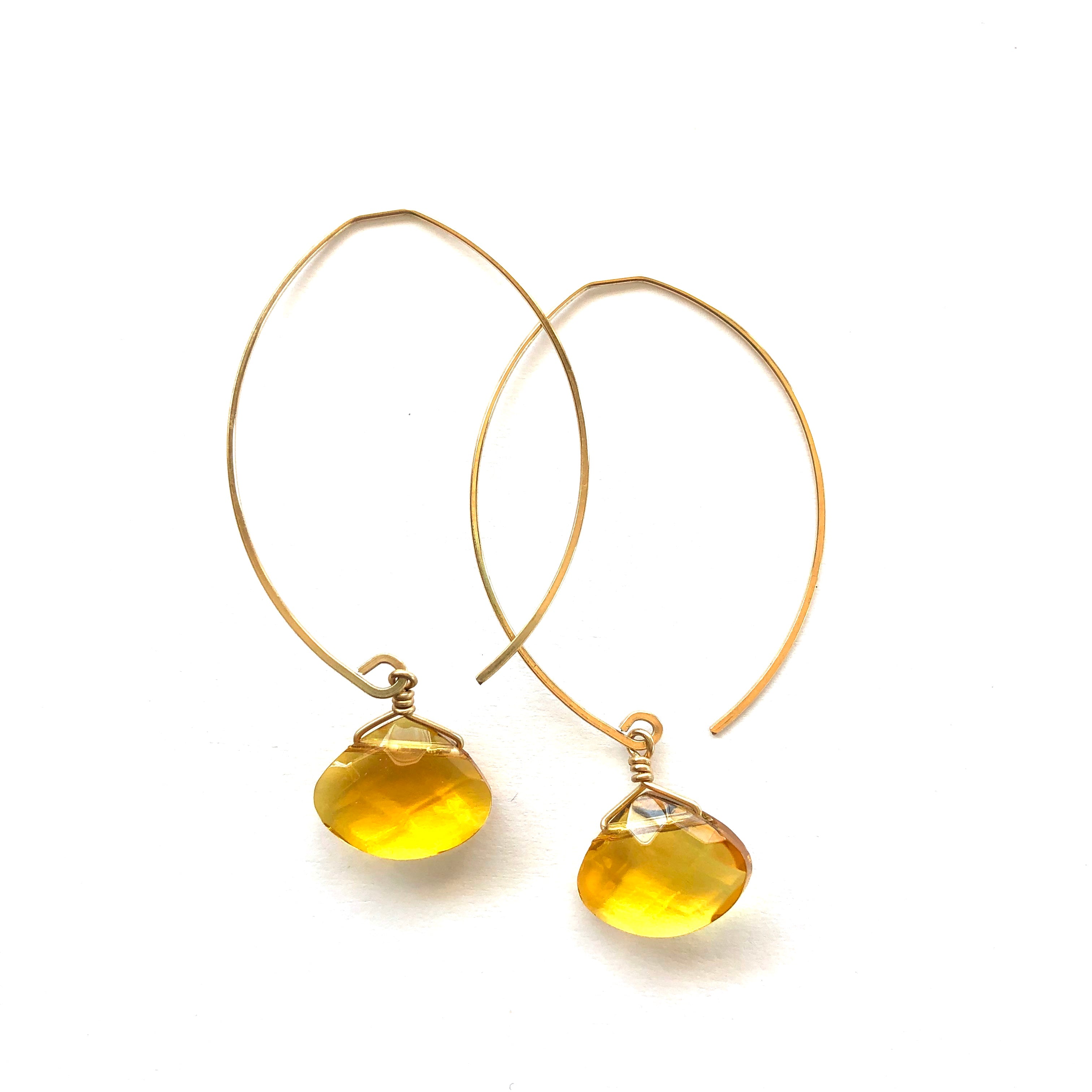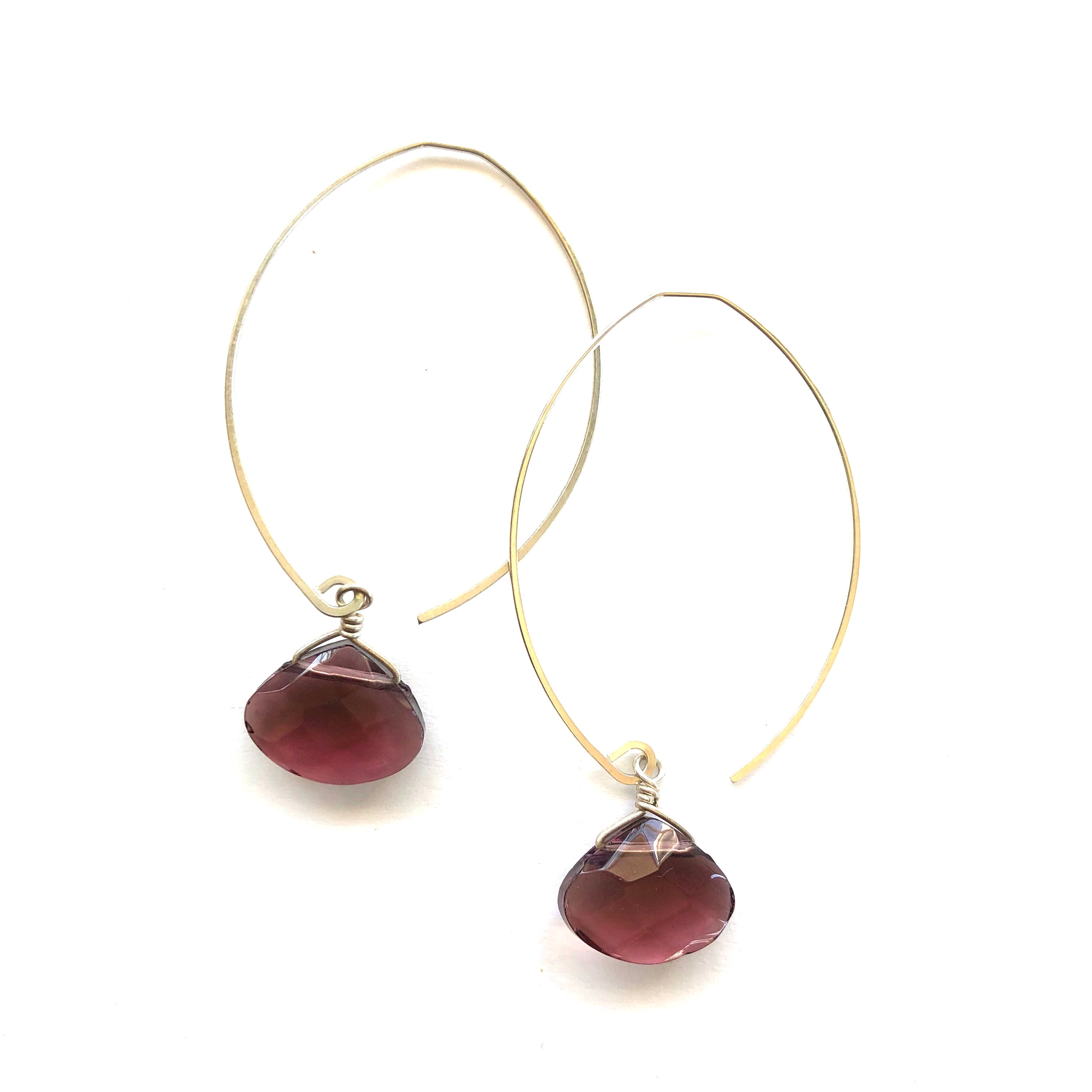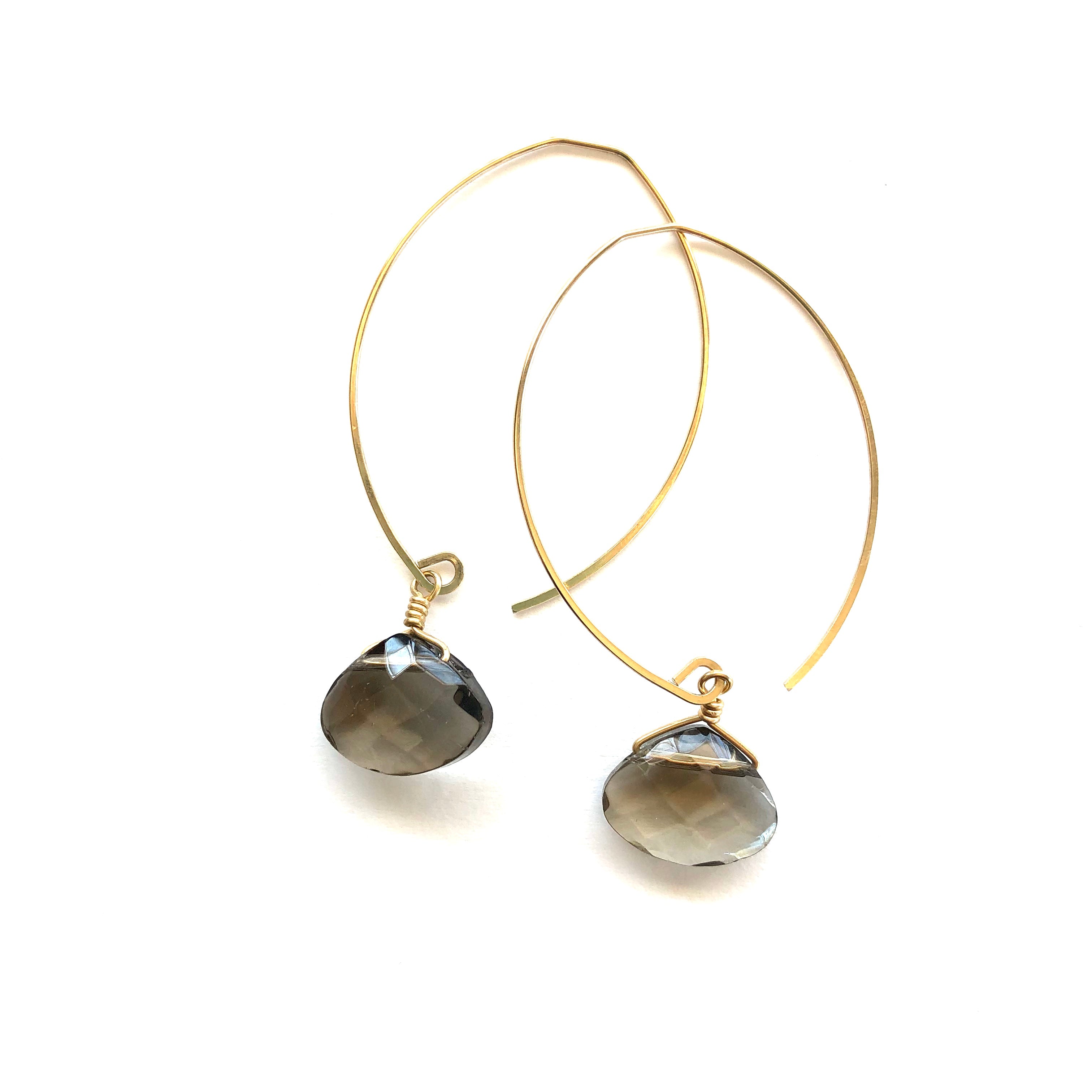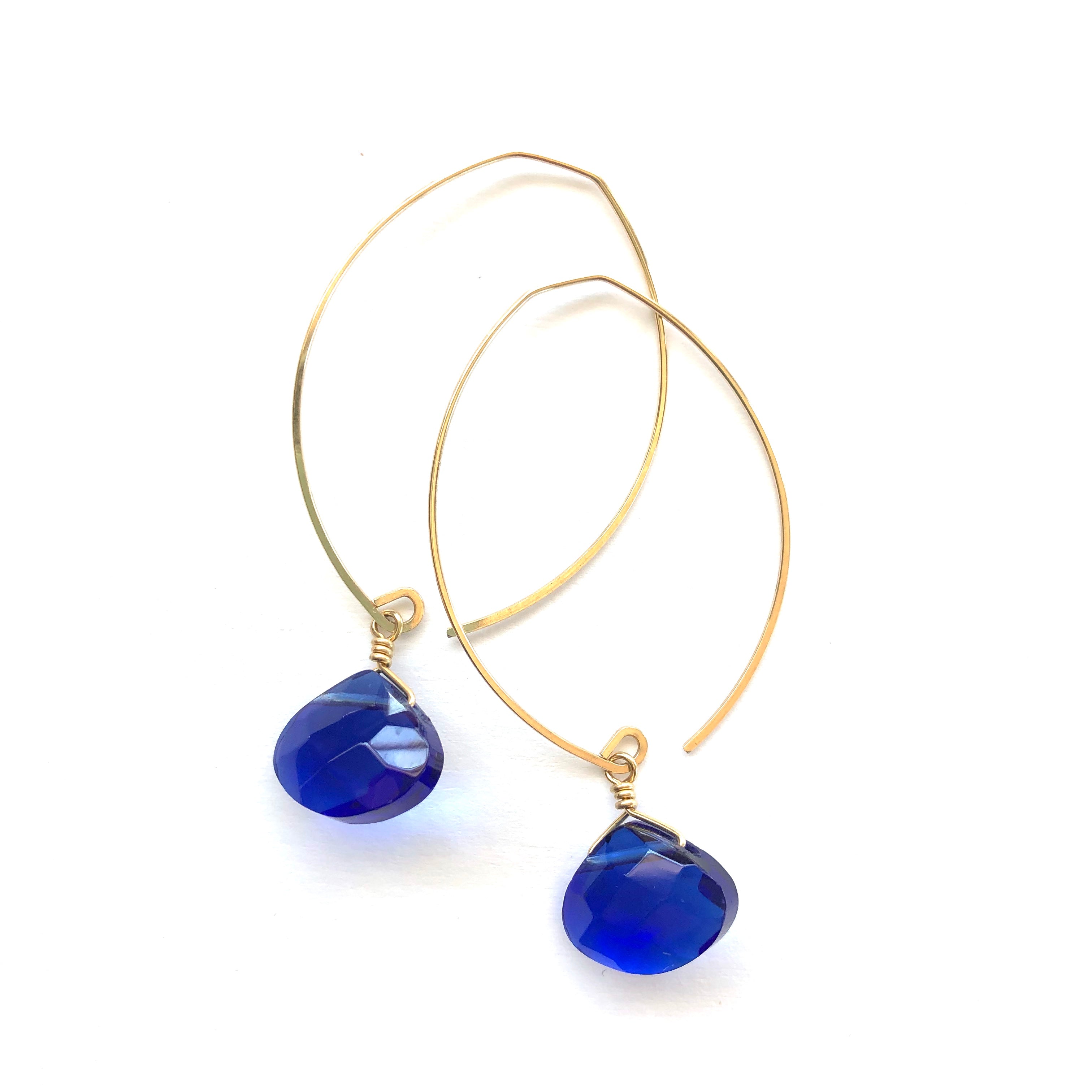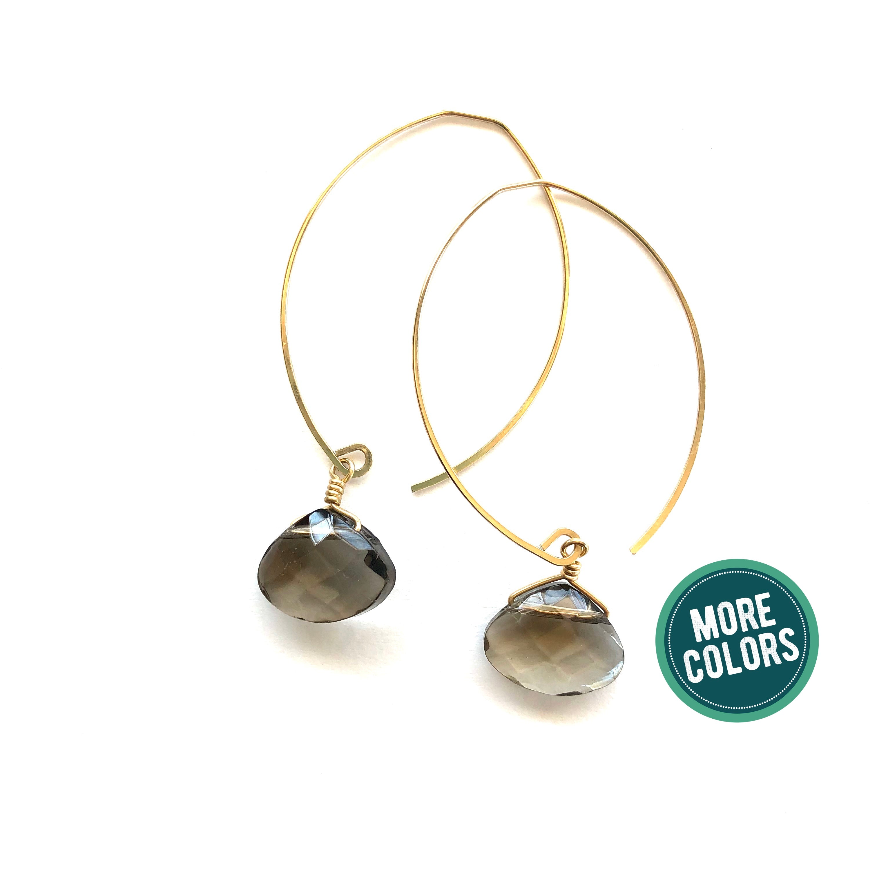 these limited colors are part of our core collection and are similar in size to our sale faceted briolette earrings but these are a bit shorter and a bit longer, more oblong shaped. available in sterling silver and 14k gold fill and hang off our classic size ear wire.