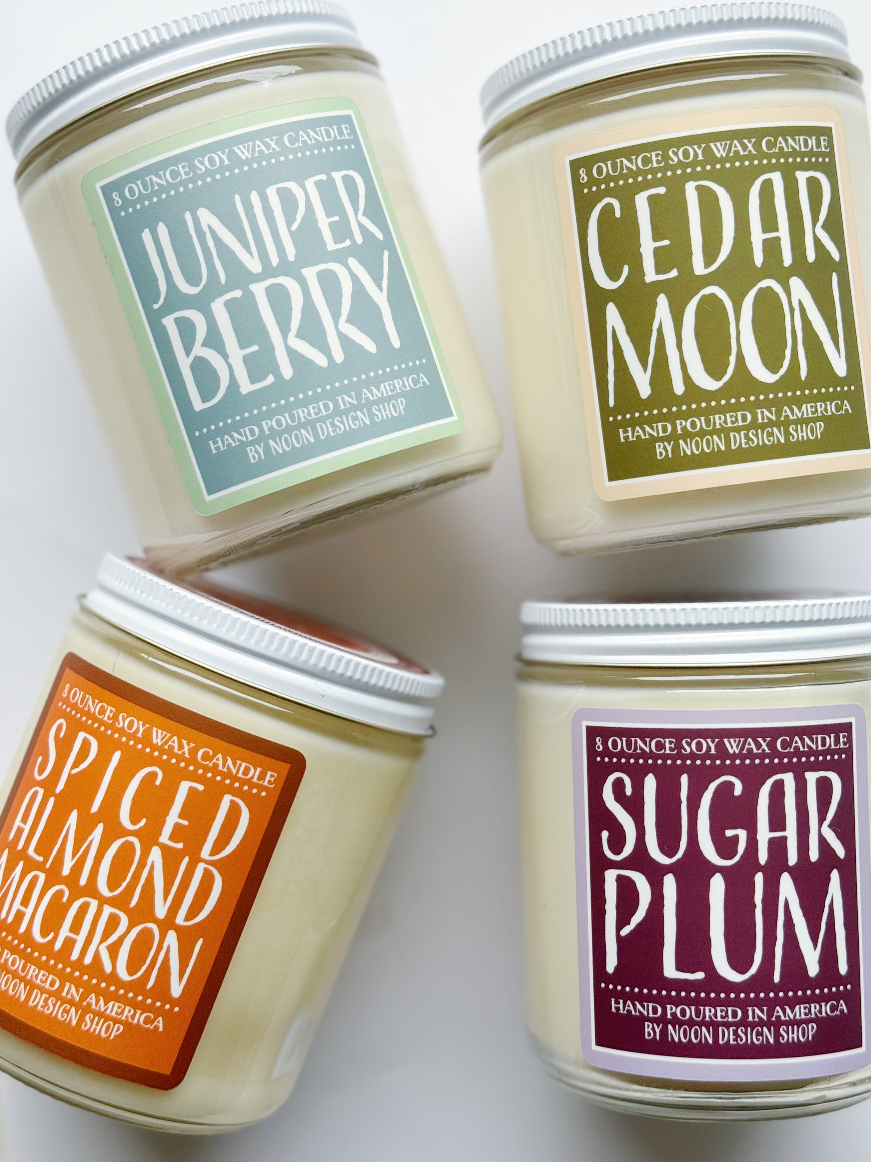 This 8 ounce hand poured candle is made with renewable, biodegradable, water soluble, US grown soy wax, essential and fragrance oil blend and a cotton wick.