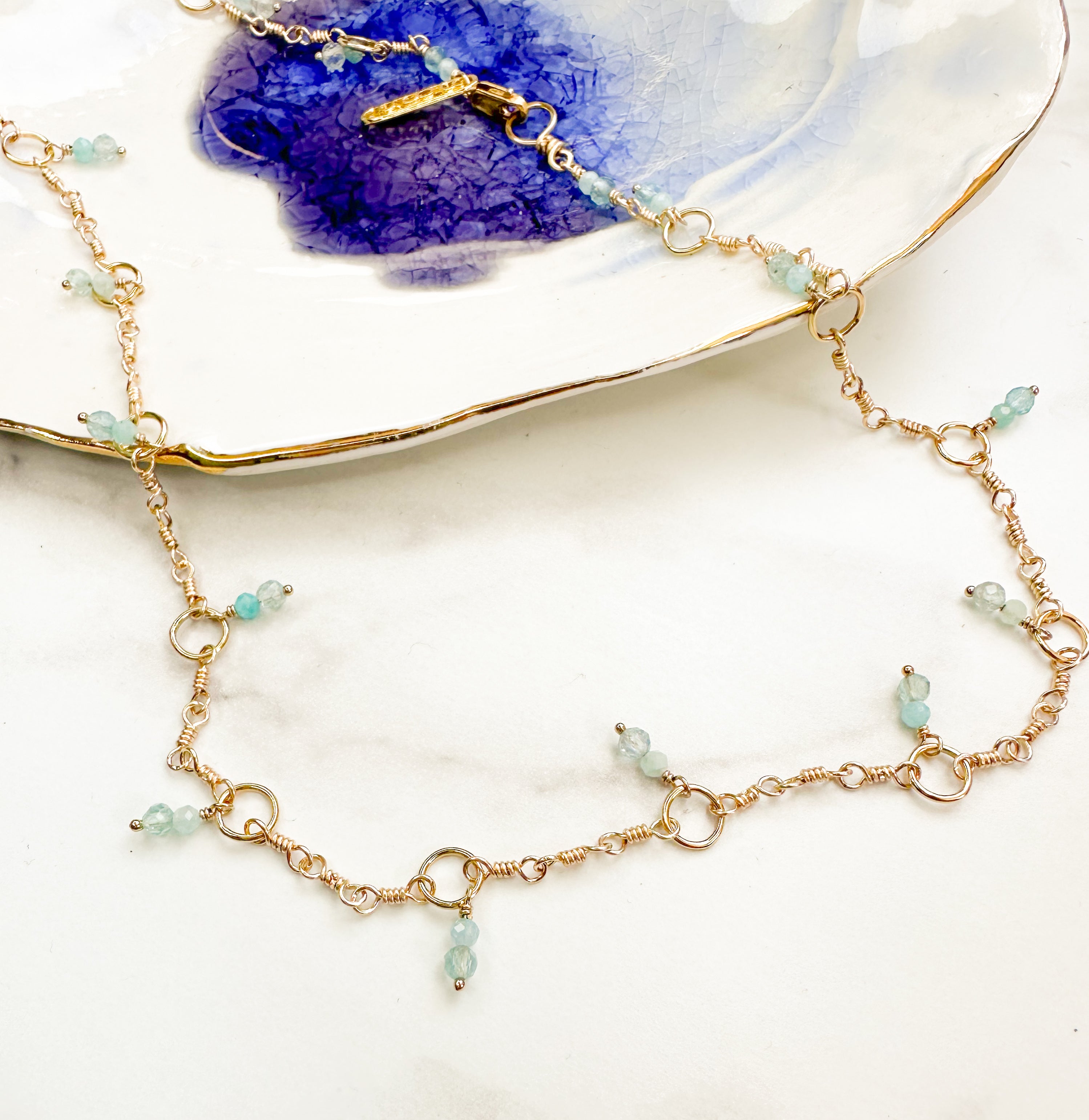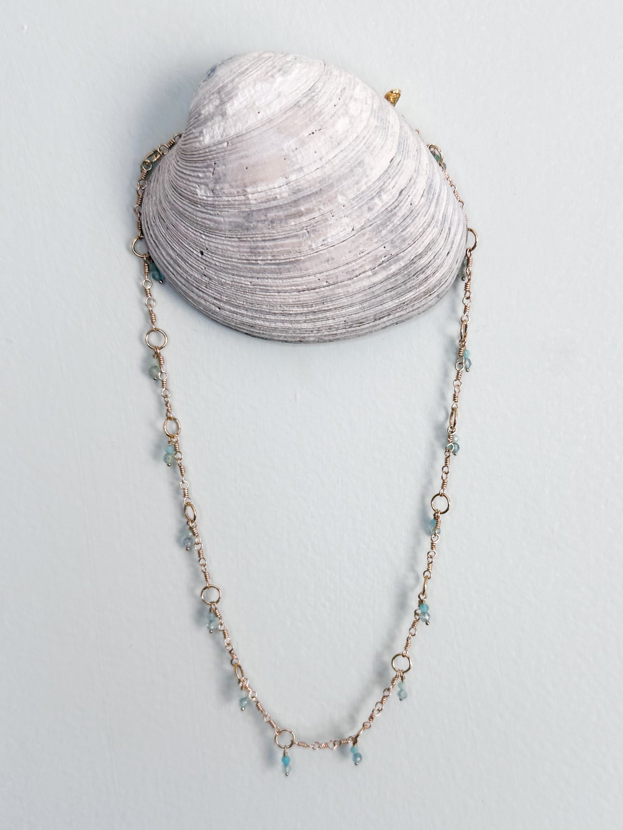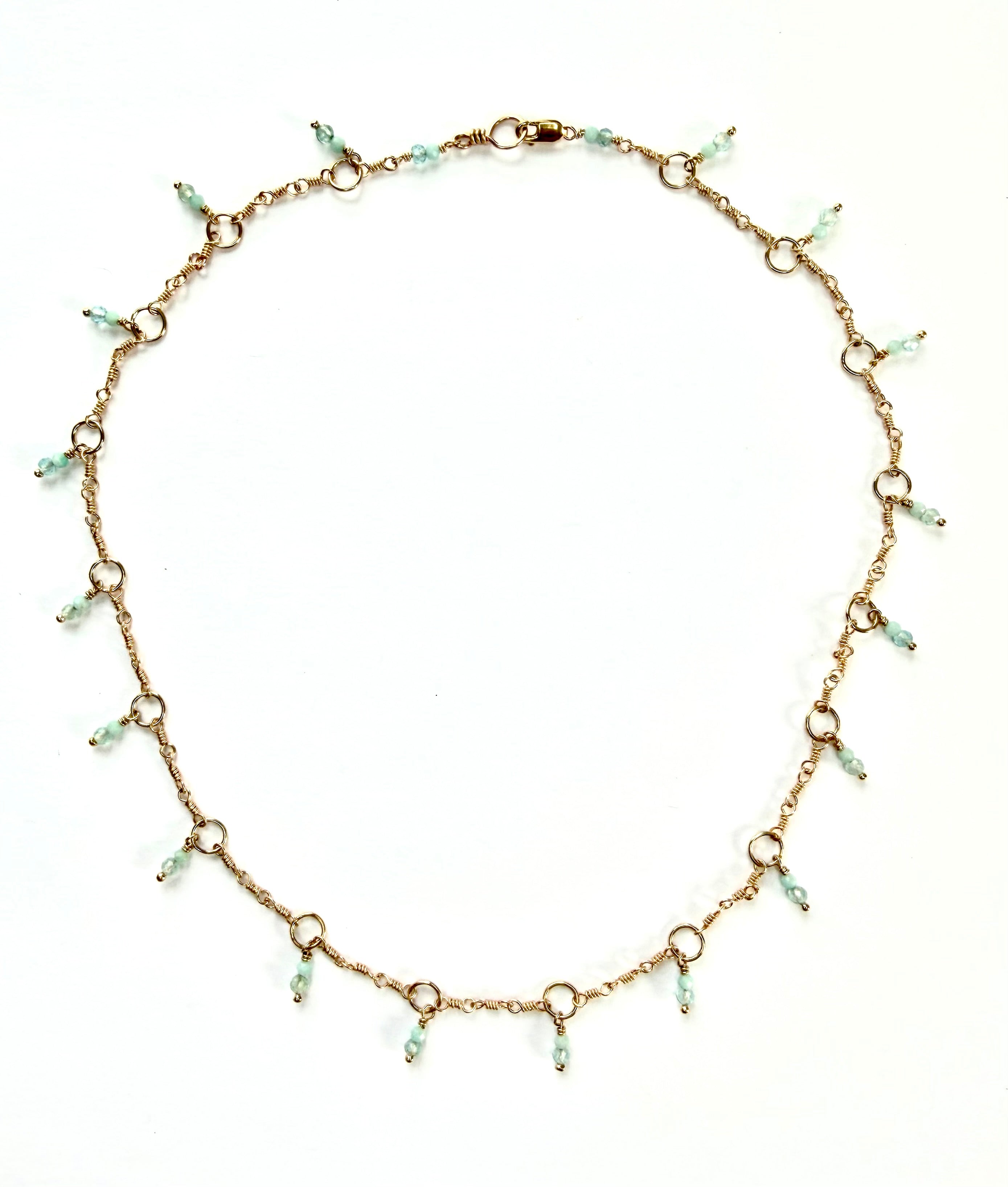 We started making these wrapped necklaces over the summer and am totally in love with them. Each link is hand wrapped in either 14k gold fill or sterling silver wire. Every third link there is a closed jump ring that has a gemstone dangling from it. Each necklace is one of a kind, using unusual and unique color and stone combinations.