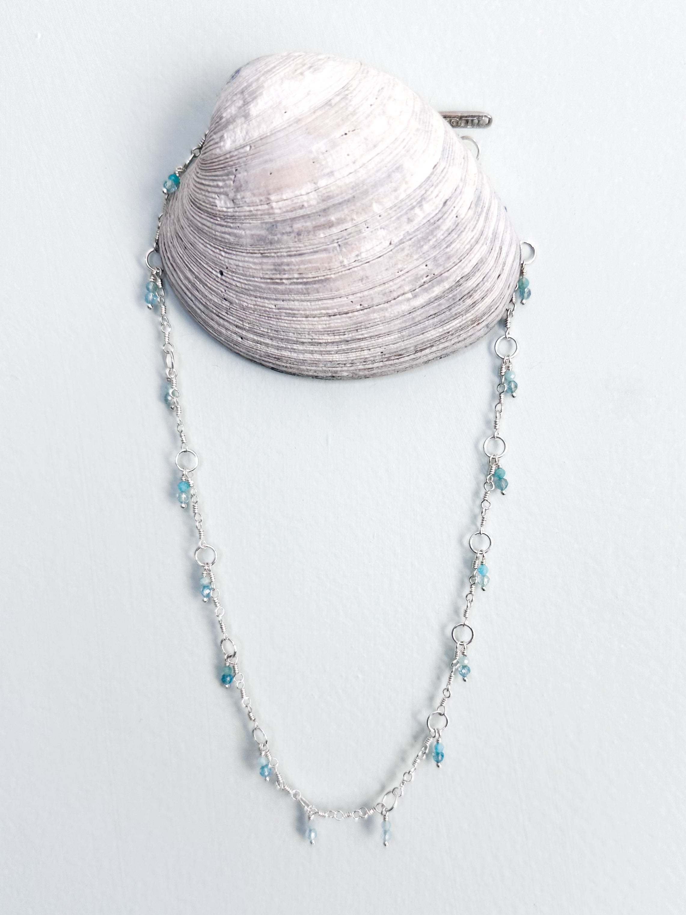 The necklace pictured below has a round, faceted ,pale blue aquamarine gemstone on the bottom with a slightly smaller, more milky blue ,round, faceted chalcedony gemstone on top