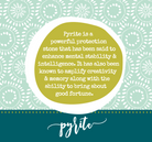 PYRITE: Pyrite is a powerful protection stone that has been said to enhance mental stability & intelligence. It has also been known to amplify creativity & memory along with bringing about good fortune.
