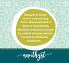 AMETHYST: Amethyst is known to be a very calming stone. It has been said to work in the physical, emotional & spiritual planes to promote balance, peace & can help to eliminate impatience.