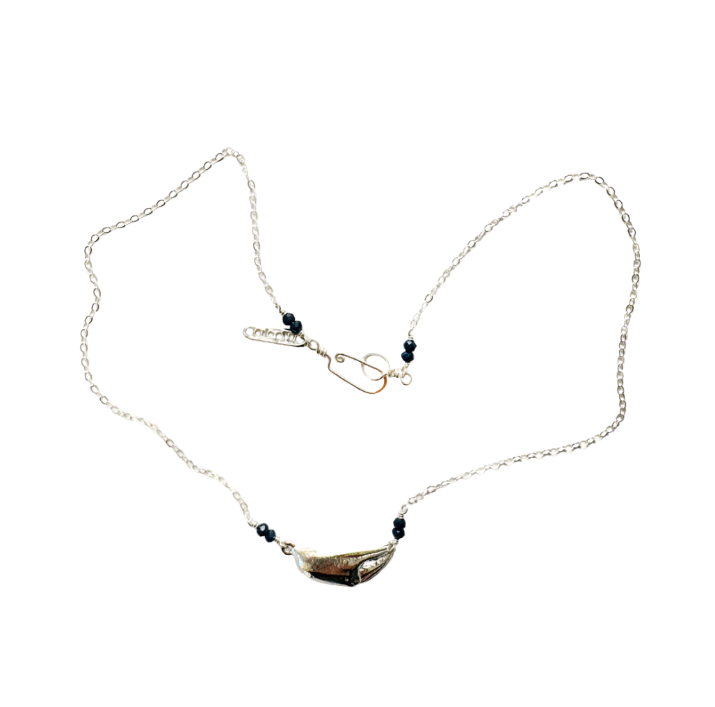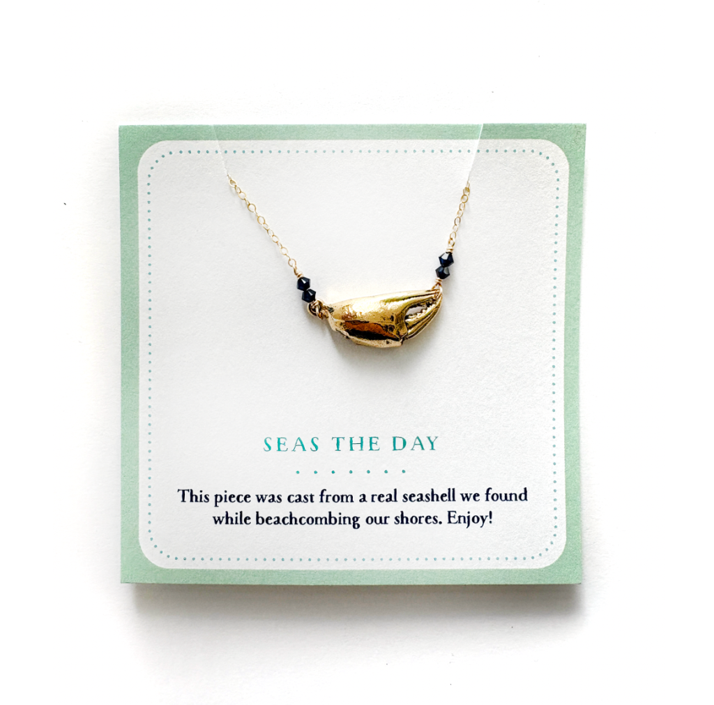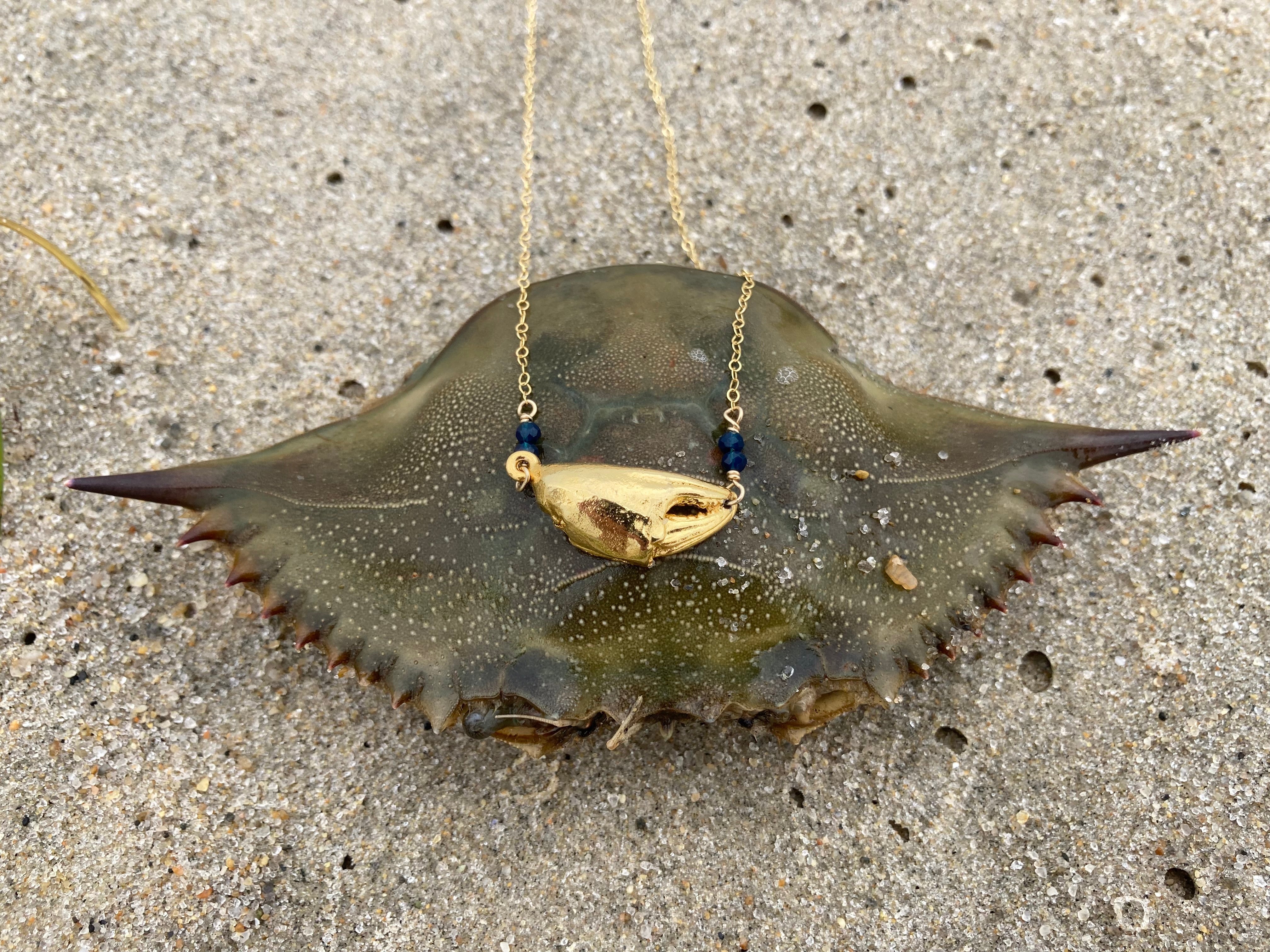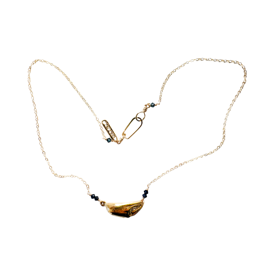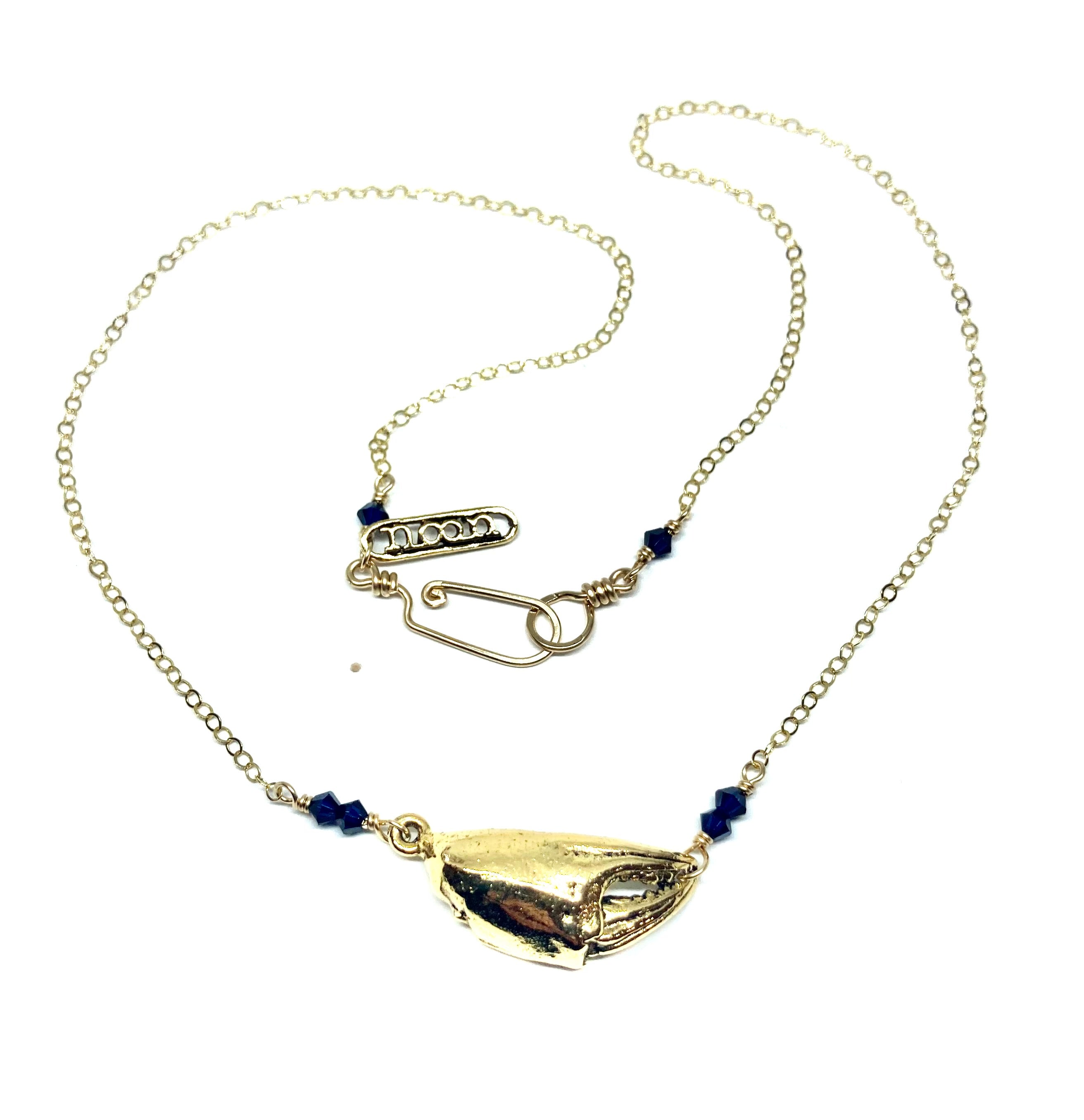 available in silver and gold plated casted clam with sterling or 14k gold fill chain