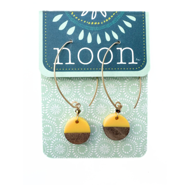 Half wood/half colored resin, these discs measure 5/8" diameter and are paired with a mini accent crystal. we hang them on our mini sized ear wire, the total length is just over 2 1/4" long.