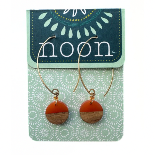Half wood/half colored resin, these discs measure 5/8" diameter and are paired with a mini accent crystal. we hang them on our mini sized ear wire, the total length is just over 2 1/4" long.