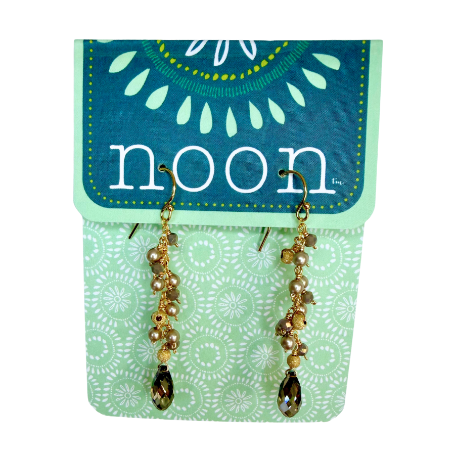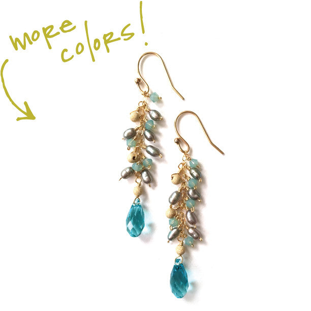 we have upgraded our vine nouveau to include these amazing combos of semiprecious stones with fresh water pearls and swarovski crystals. these stones are slightly larger that our original vine nouveau, but a perfect proportion to the design. vine nouveau earrings hang 3" long and hoop is approximately .75" wide.