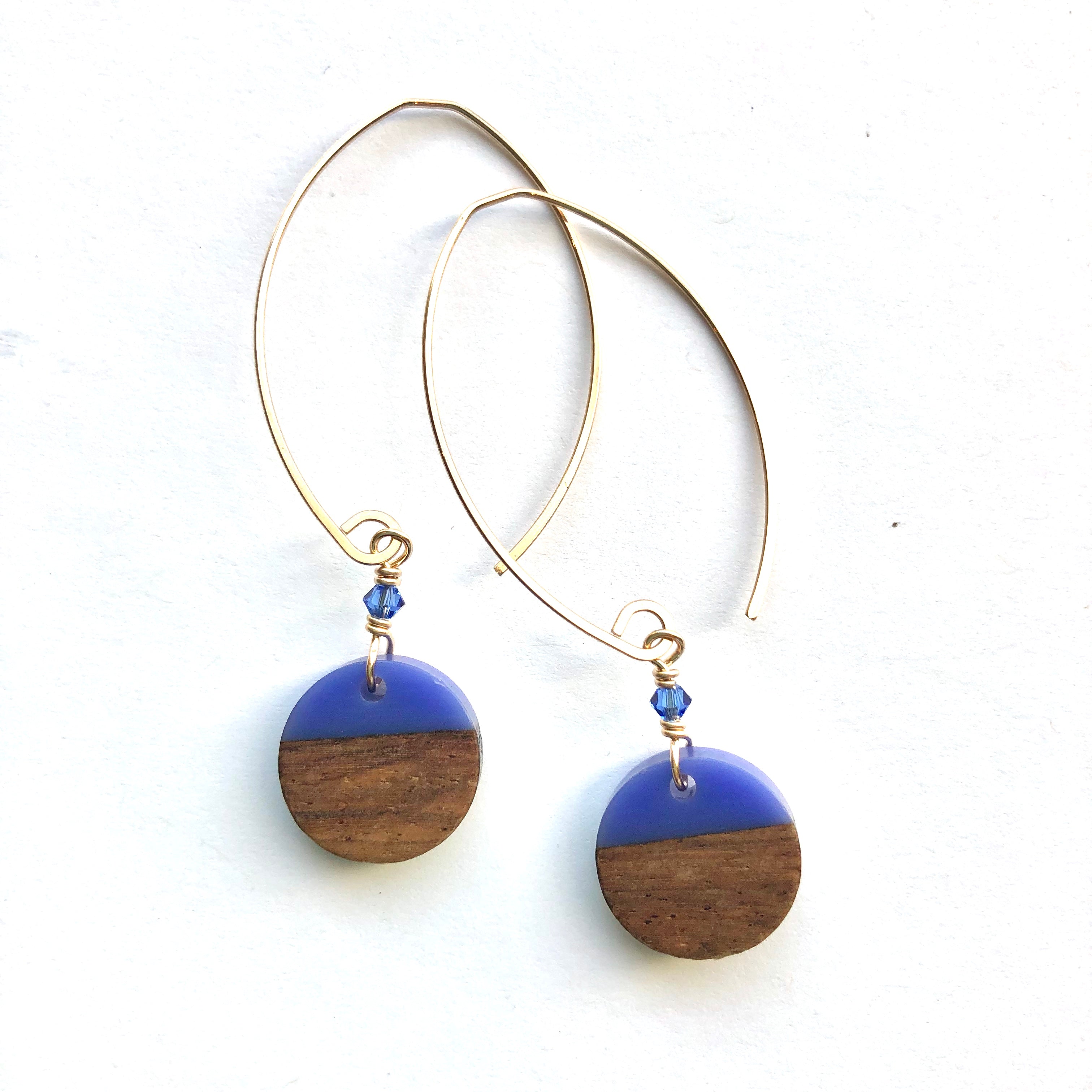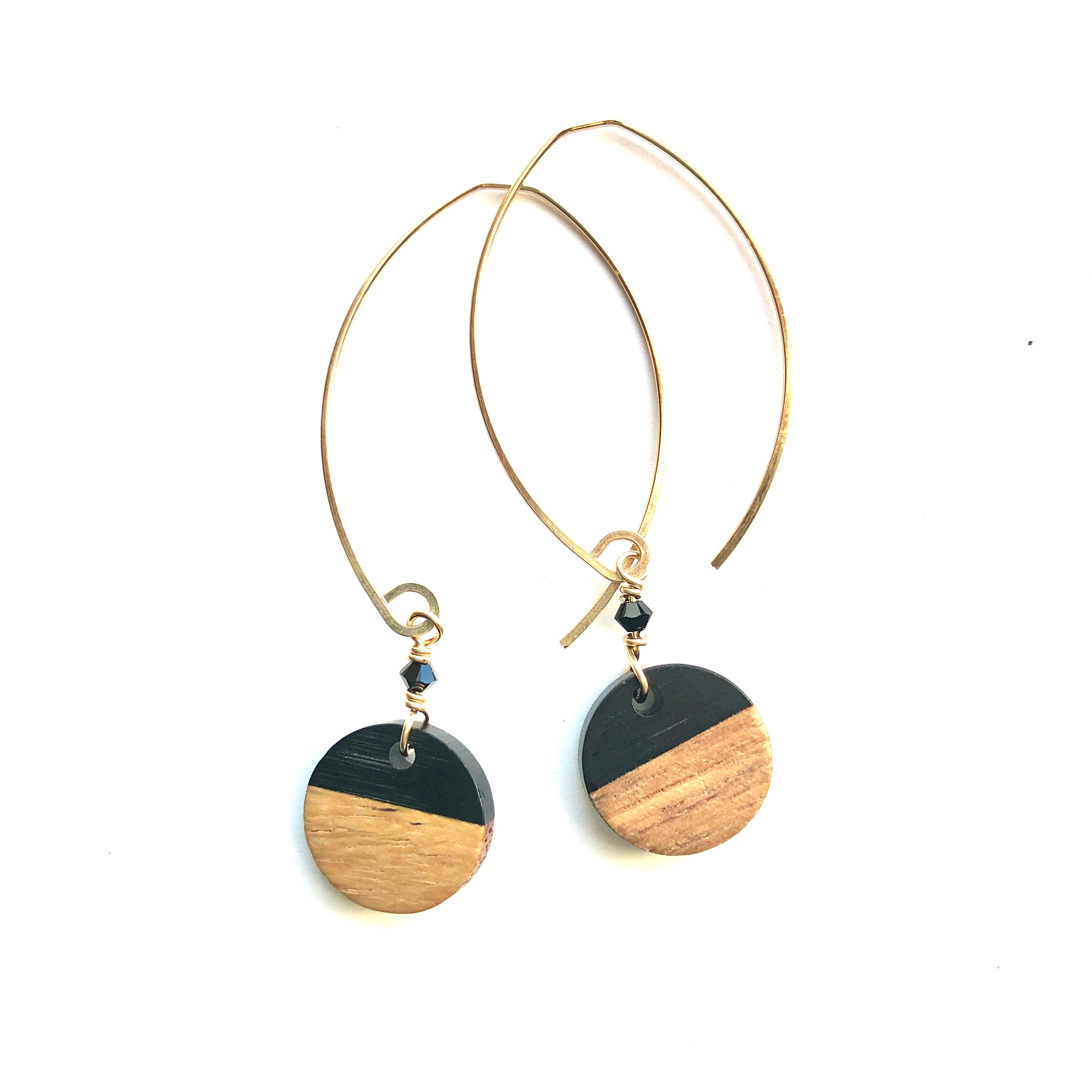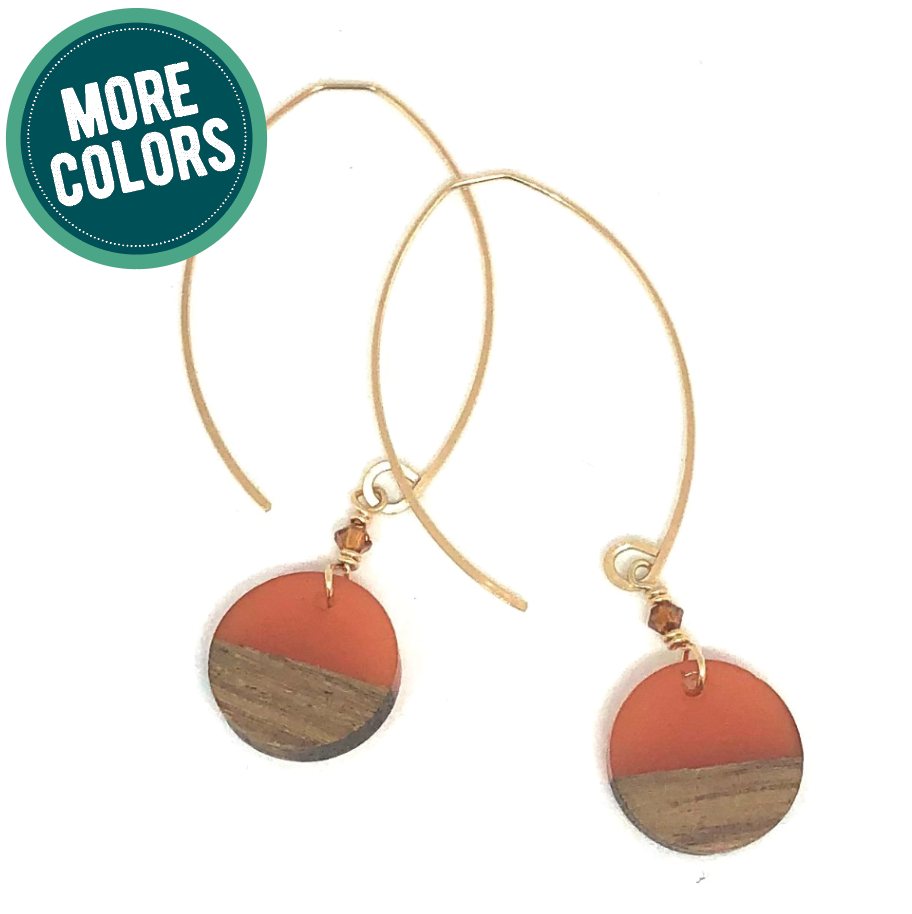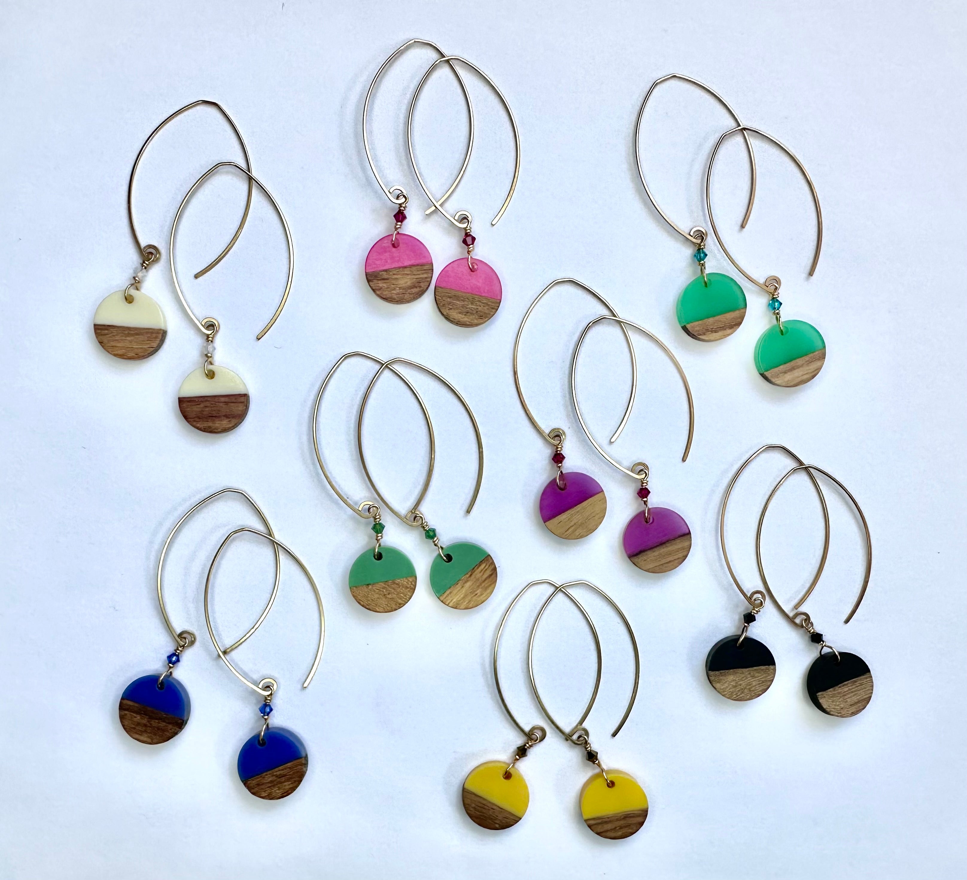 half wood/half colored resin, these discs measure 5/8" diameter and are paired with a mini swarovski accent crystal. we hang them on our mini sized ear wire, the total length is just over 2 1/4" long. they are available in sterling silver and 14k gold fill.