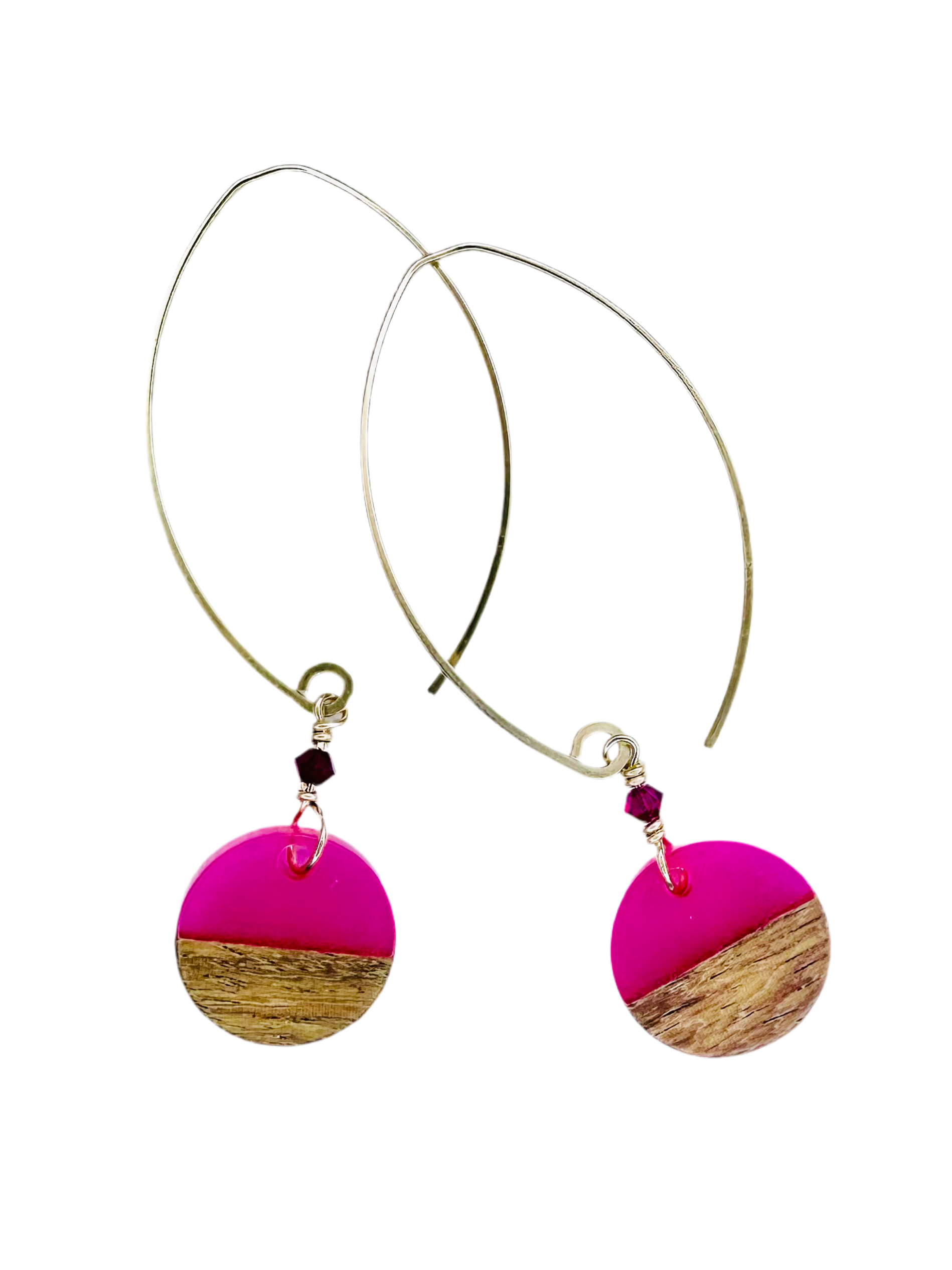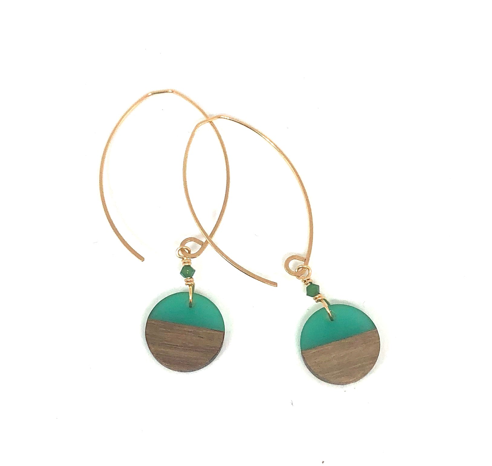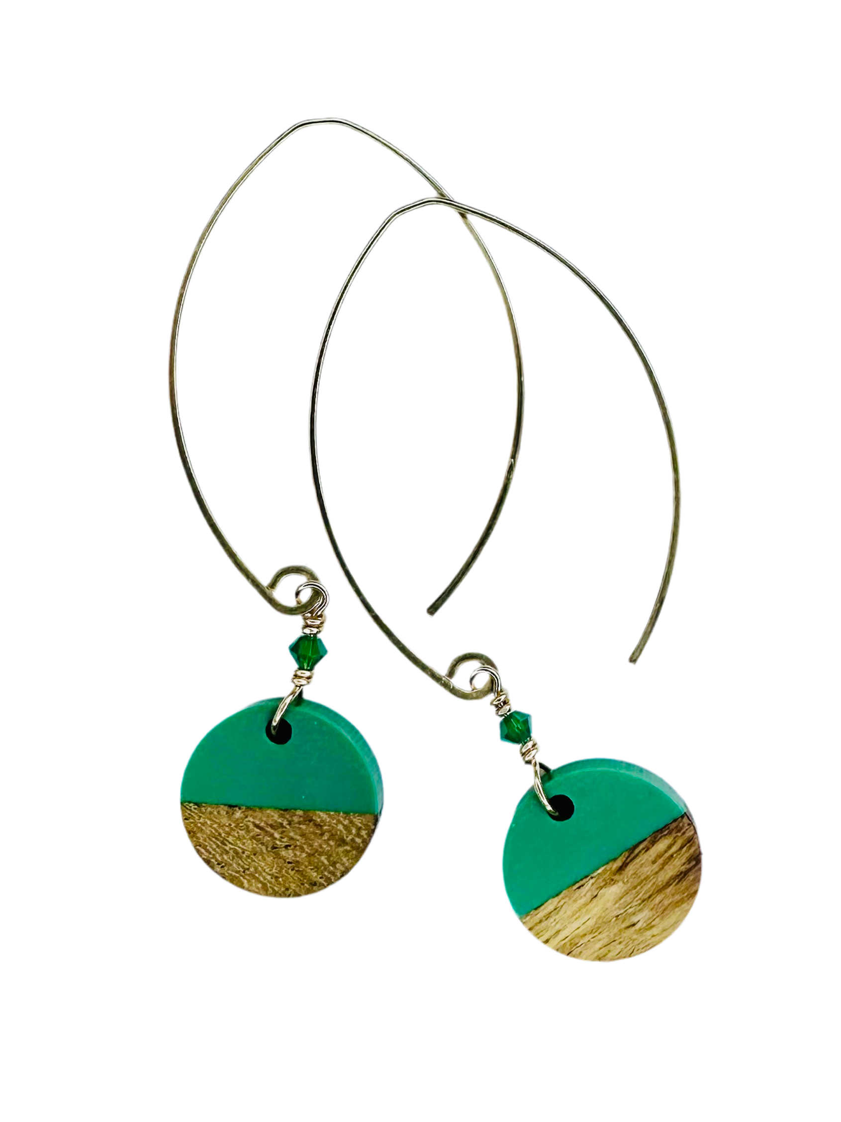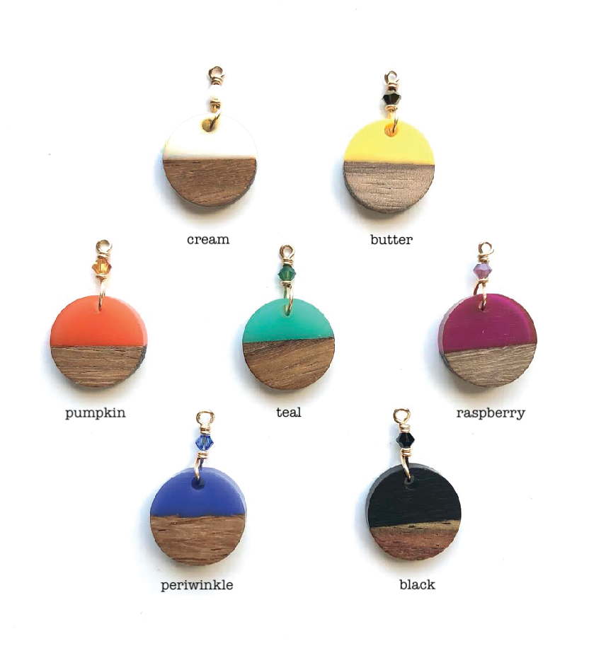 half wood/half colored resin, these discs measure 5/8" diameter and are paired with a mini swarovski accent crystal. we hang them on our mini sized ear wire, the total length is just over 2 1/4" long. they are available in sterling silver and 14k gold fill.