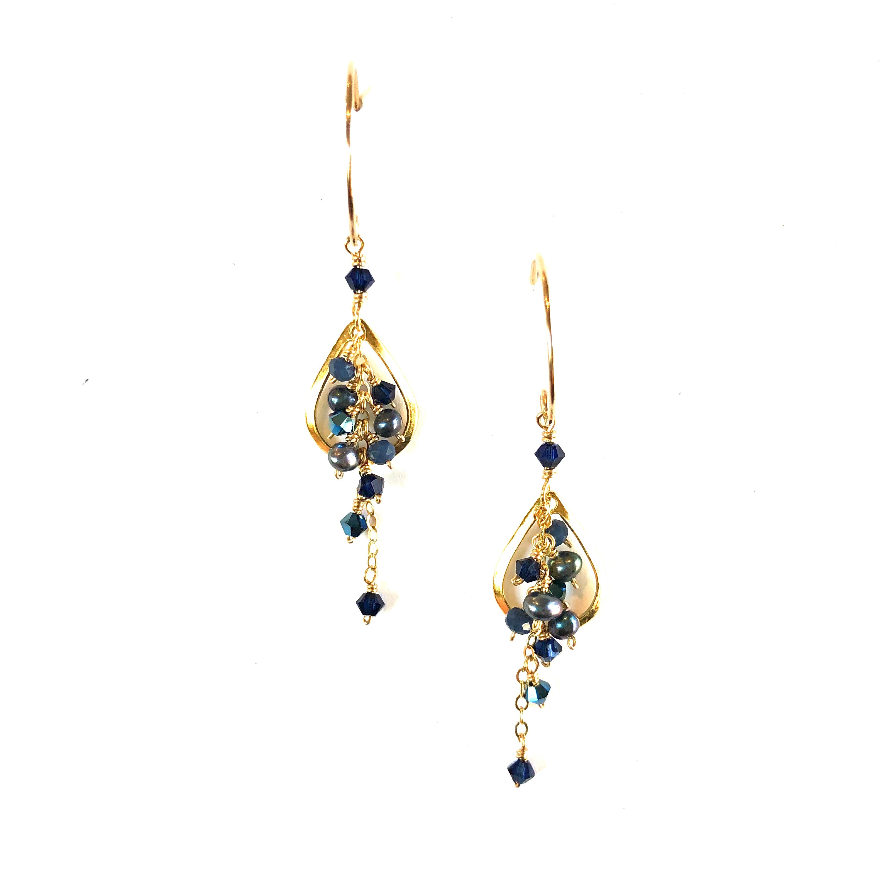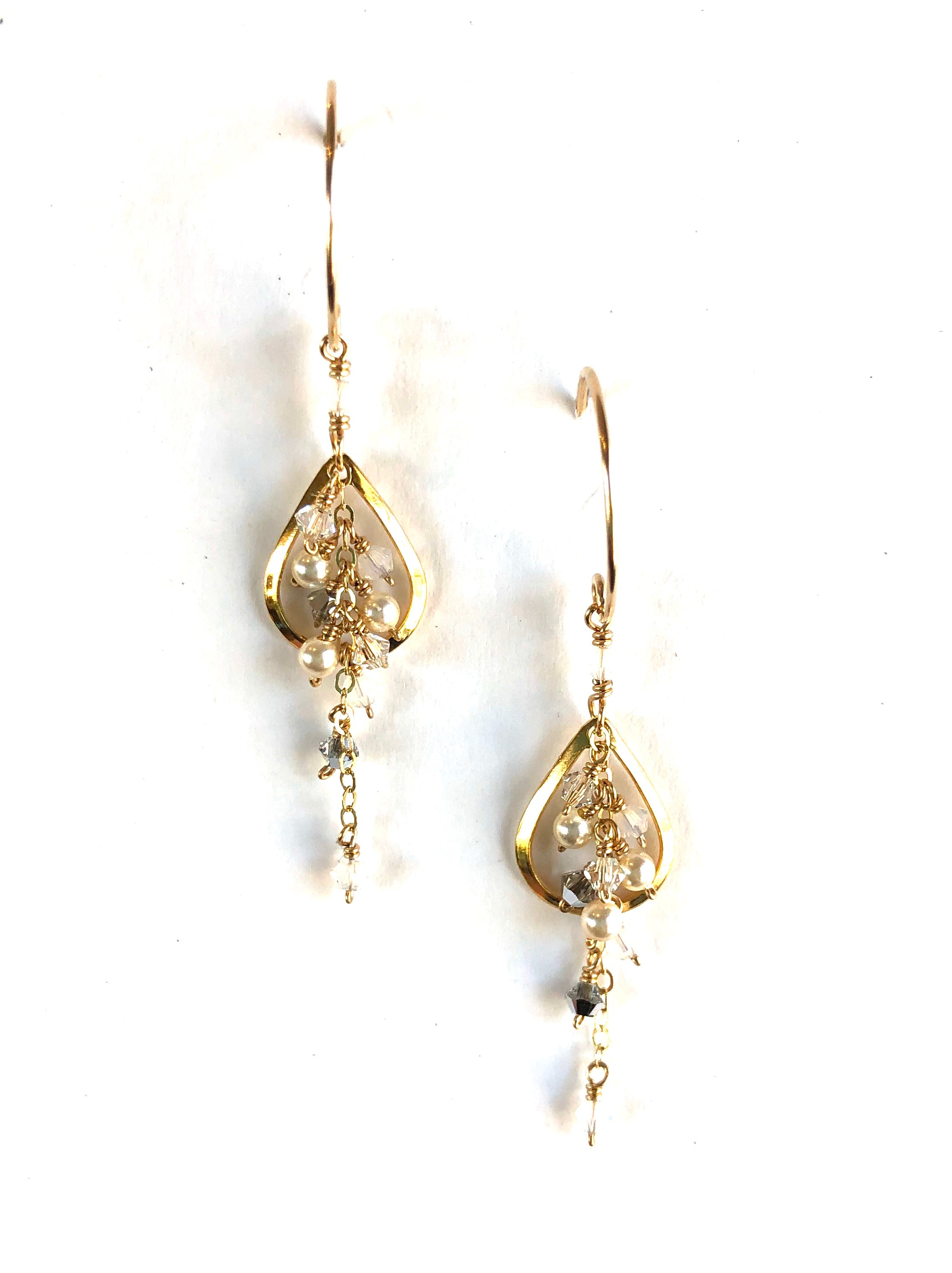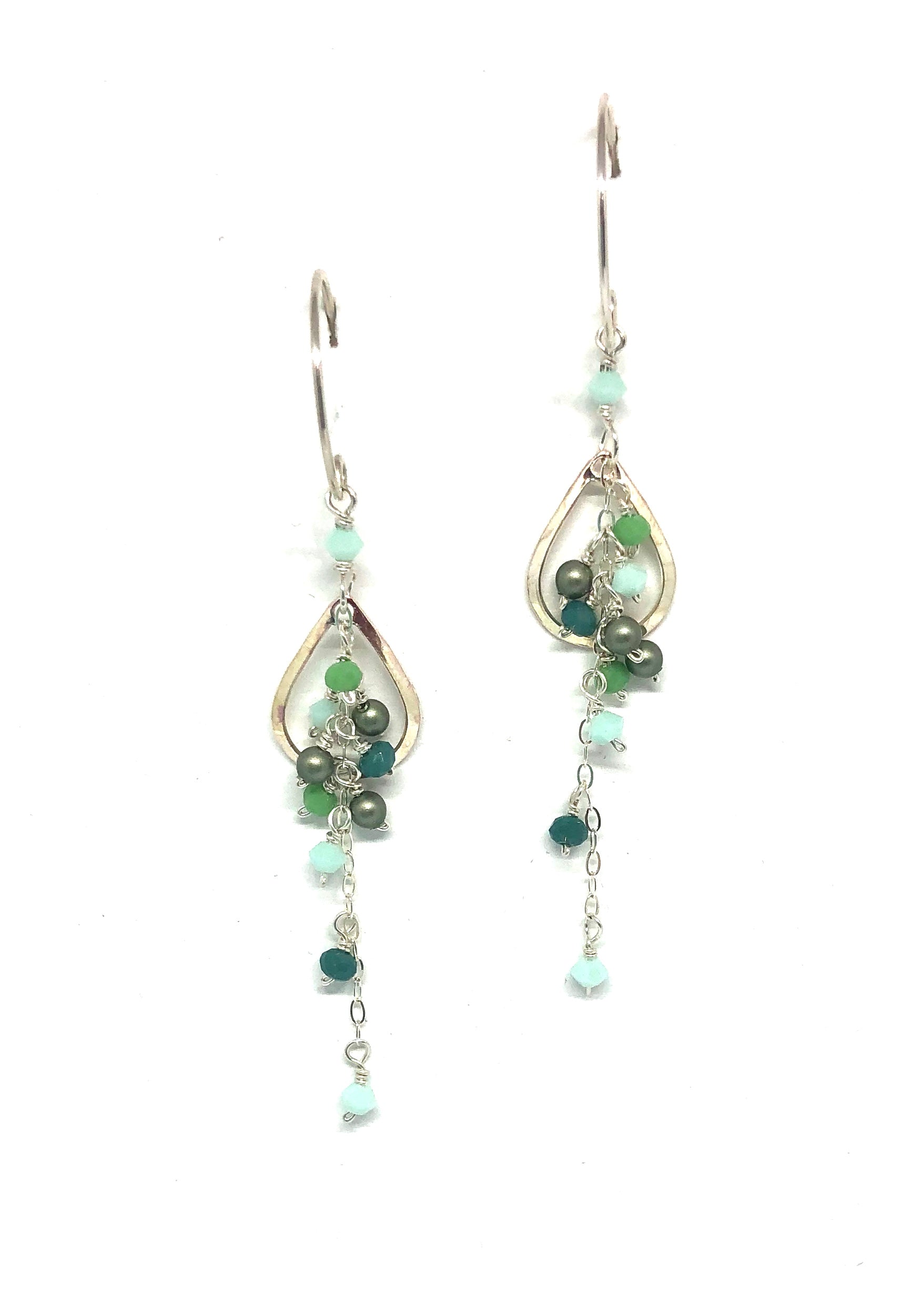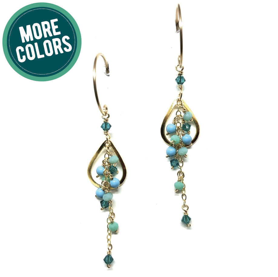 Delicately cascading like a vine, our Grecian Vine earrings bring an elegant yet whimsical touch to any outfit. Featuring luminous pearls and shimmering crystals, each earring is adorned with a teardrop shaped accent that enhances it graceful movement. Suspended from our signature round ear wires, available in gold fill or sterling. These earrings are very lightweight, sophisticated, and perfect of any occasion. Chose form one of our many color combinations.
