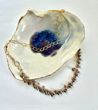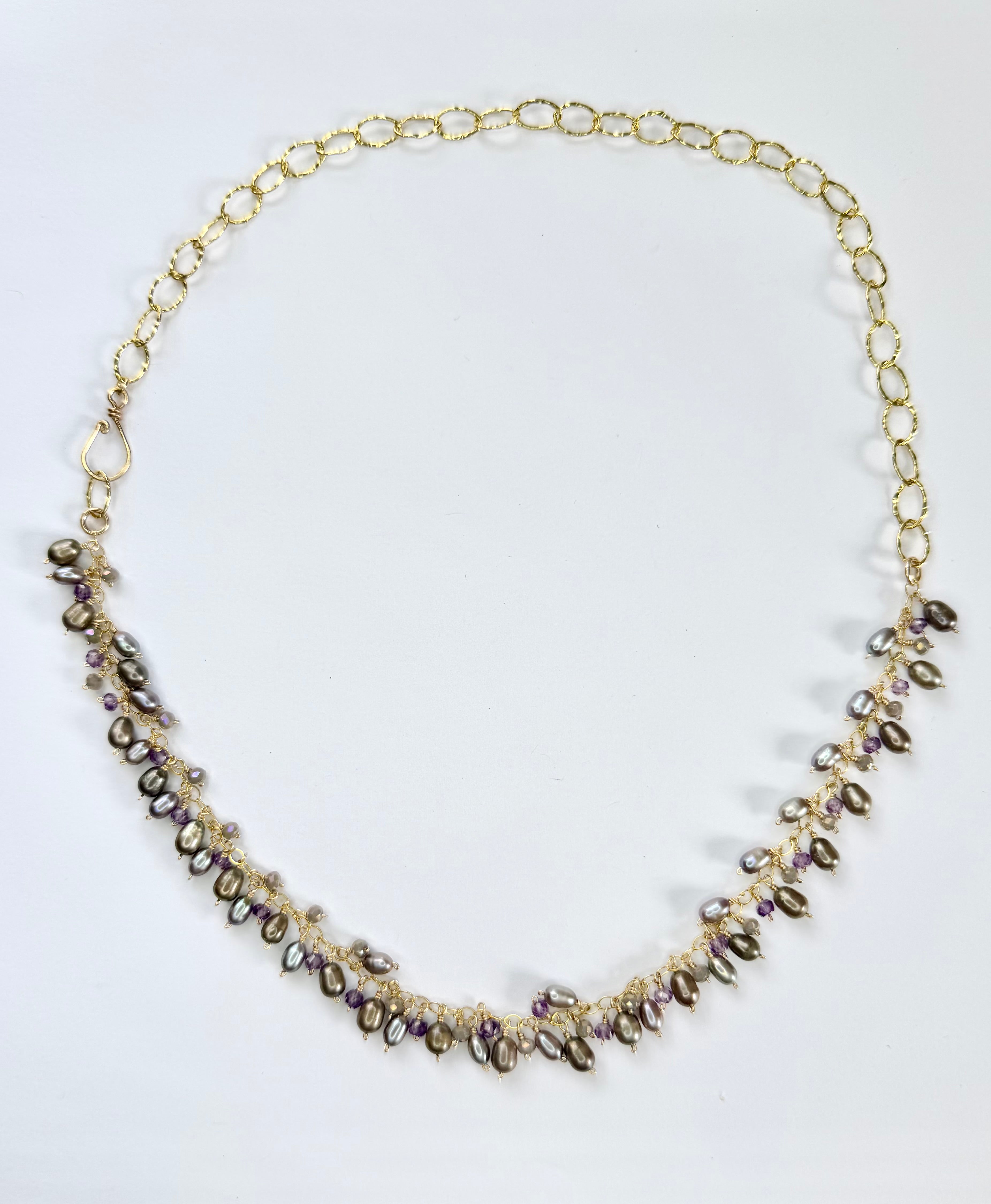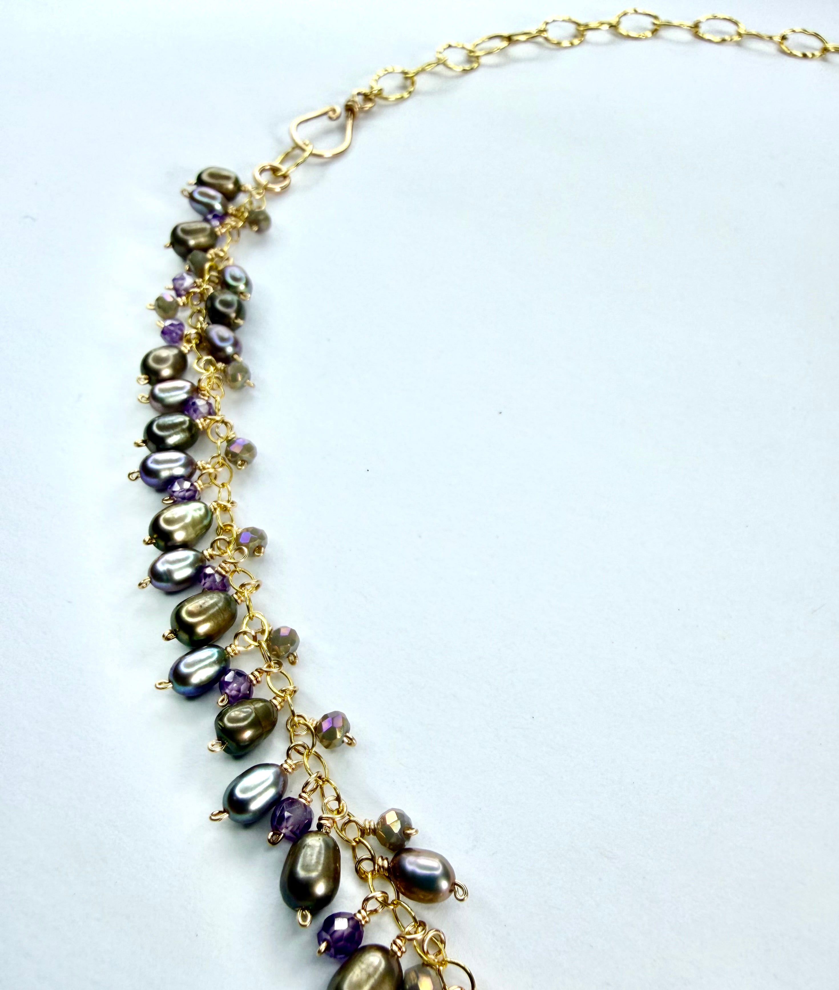 One of a kind. We took our cluster vine bracelet style and made it into a necklace. A beautiful collection of gray fresh water pearls, amethyst and Swarovski crystals . Each individually wrapped onto a 14k gold fill chain.