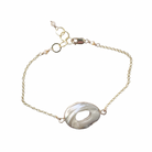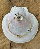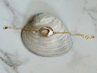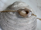 a beautiful milky, iridescent mother of pearl slice with gold edging. attached to a 14k gold fill chain.