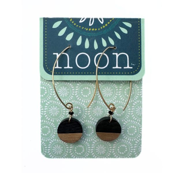 Half wood/half colored resin, these discs measure 5/8" diameter and are paired with a mini accent crystal. we hang them on our mini sized ear wire, the total length is just over 2 1/4" long.