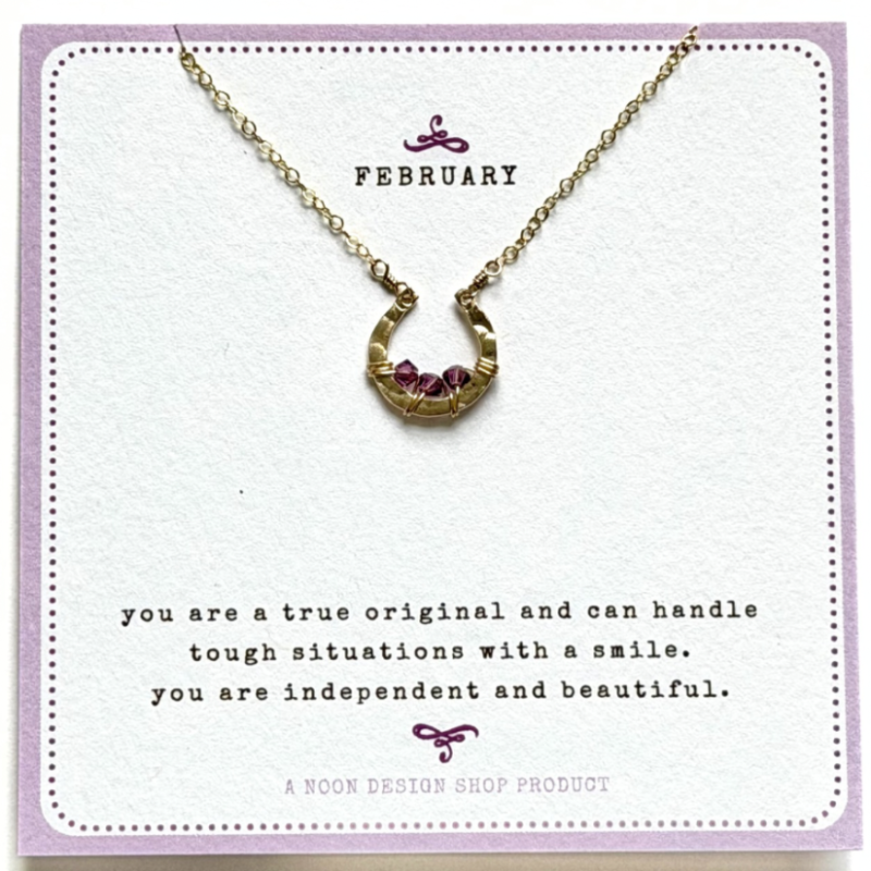 each handmade hammered horseshoe necklace has three swarovski birthstone accent beads wrapped around it and comes adorably packaged with individual month's fortune. available in sterling silver or 14k gold fill. 17" long